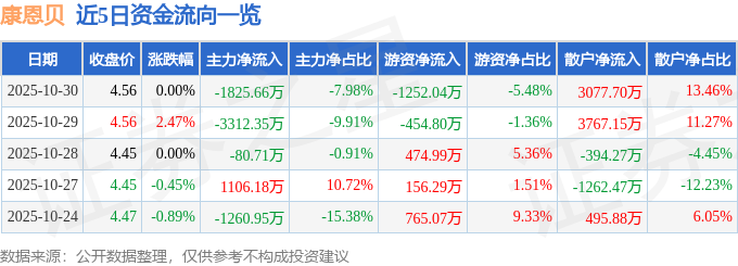 10月30日的资金流向数据方面,主力资金净流出1825.66万元,占总成交额7.98%,游资资金净流出1252.04万元,占总成交额5.48%,散户资金净流入3077.7万元,占总成交额13.46%。