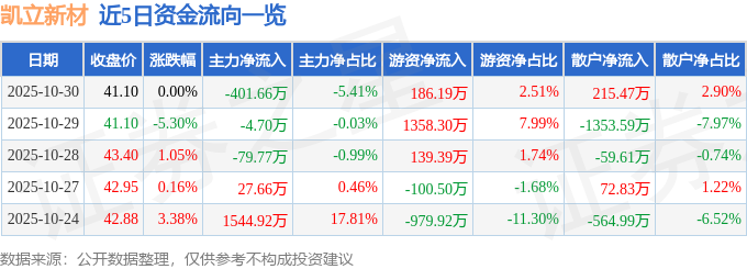 10月30日的资金流向数据方面,主力资金净流出401.66万元,占总成交额5.41%,游资资金净流入186.19万元,占总成交额2.51%,散户资金净流入215.47万元,占总成交额2.9%。