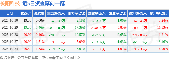 10月30日的资金流向数据方面,主力资金净流出456.39万元,占总成交额2.18%,游资资金净流出223.03万元,占总成交额1.06%,散户资金净流入679.43万元,占总成交额3.24%。