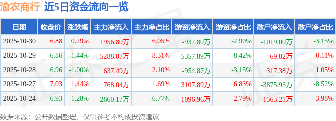 证券之星消息,截至2025年10月30日收盘,渝农商行(601077)报收于6.88元,上涨0.29%,换手率0.53%,成交量46.84万手,成交额3.23亿元。