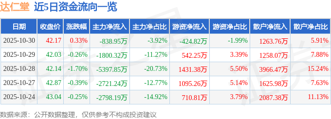 证券之星消息,截至2025年10月30日收盘,达仁堂(600329)报收于42.17元,上涨0.33%,换手率0.9%,成交量5.1万手,成交额2.14亿元。