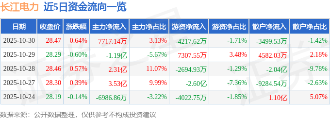 证券之星消息,截至2025年10月30日收盘,长江电力(600900)报收于28.47元,上涨0.64%,换手率0.36%,成交量86.72万手,成交额24.65亿元。