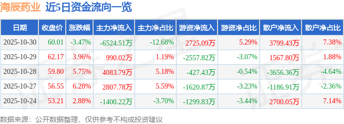 证券之星消息,截至2025年10月30日收盘,海辰药业(300584)报收于60.01元,下跌3.47%,换手率10.26%,成交量8.43万手,成交额5.15亿元。