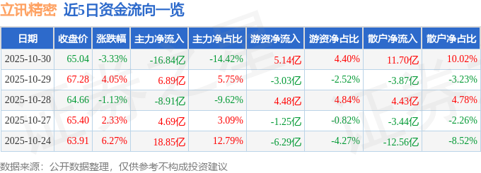 证券之星消息,截至2025年10月30日收盘,立讯精密(002475)报收于65.04元,下跌3.33%,换手率2.46%,成交量178.79万手,成交额116.76亿元。