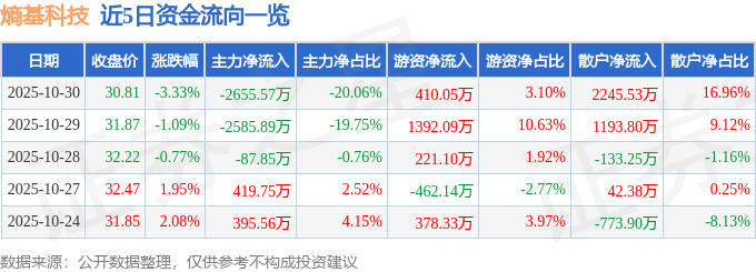 证券之星消息,截至2025年10月30日收盘,熵基科技(301330)报收于30.81元,下跌3.33%,换手率3.74%,成交量4.26万手,成交额1.32亿元。