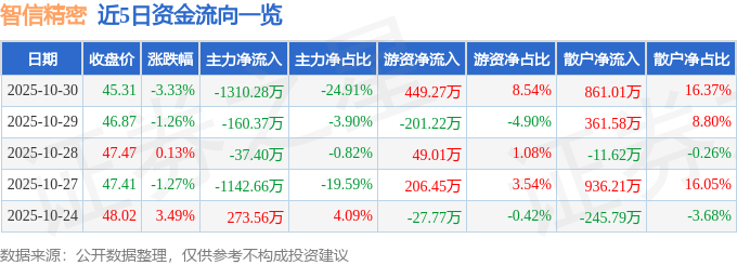 证券之星消息,截至2025年10月30日收盘,智信精密(301512)报收于45.31元,下跌3.33%,换手率4.62%,成交量1.15万手,成交额5259.29万元。
