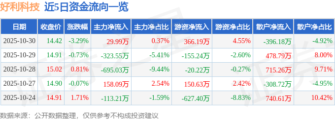 证券之星消息,截至2025年10月30日收盘,好利科技(002729)报收于14.42元,下跌3.29%,换手率3.17%,成交量5.56万手,成交额8045.84万元。