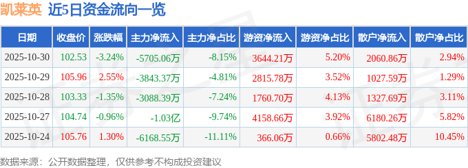 10月30日的资金流向数据方面,主力资金净流出5705.06万元,占总成交额8.15%,游资资金净流入3644.21万元,占总成交额5.2%,散户资金净流入2060.86万元,占总成交额2.94%。