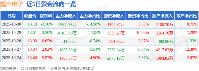 证券之星消息,截至2025年10月30日收盘,超声电子(000823)报收于13.18元,下跌3.16%,换手率3.37%,成交量18.09万手,成交额2.4亿元。