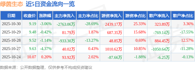 证券之星消息,截至2025年10月30日收盘,绿茵生态(002887)报收于9.19元,下跌3.06%,换手率5.31%,成交量10.33万手,成交额9629.55万元。
