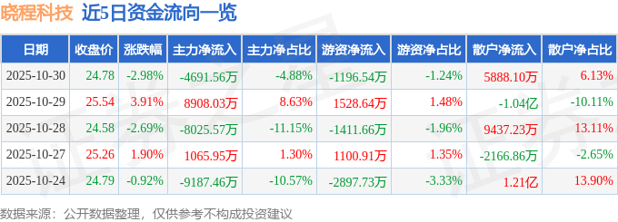 证券之星消息,截至2025年10月30日收盘,晓程科技(300139)报收于24.78元,下跌2.98%,换手率16.7%,成交量39.01万手,成交额9.61亿元。