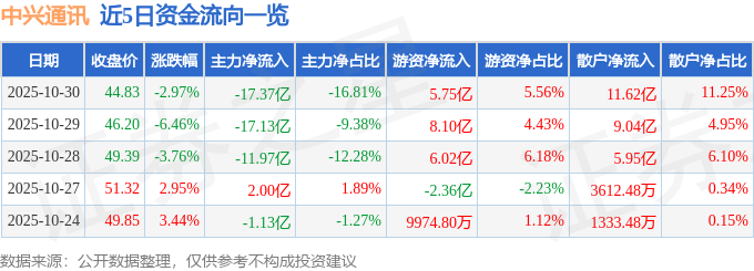 证券之星消息,截至2025年10月30日收盘,中兴通讯(000063)报收于44.83元,下跌2.97%,换手率5.67%,成交量228.52万手,成交额103.33亿元。