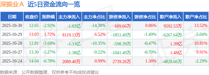 证券之星消息,截至2025年10月30日收盘,深振业A(000006)报收于12.65元,下跌2.92%,换手率4.11%,成交量55.43万手,成交额7.1亿元。