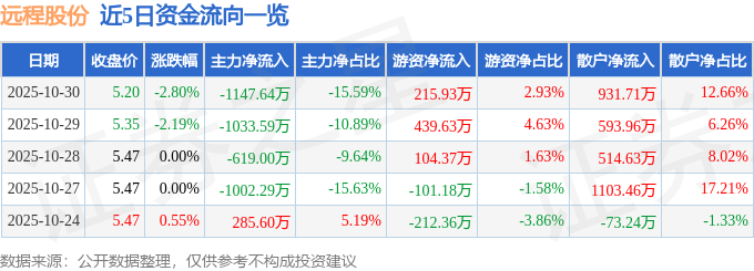 证券之星消息,截至2025年10月30日收盘,远程股份(002692)报收于5.2元,下跌2.8%,换手率1.95%,成交量14.02万手,成交额7362.23万元。
