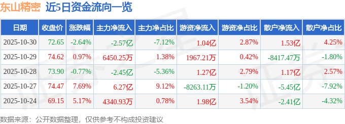 10月30日的资金流向数据方面,主力资金净流出2.57亿元,占总成交额7.12%,游资资金净流入1.04亿元,占总成交额2.87%,散户资金净流入1.53亿元,占总成交额4.25%。