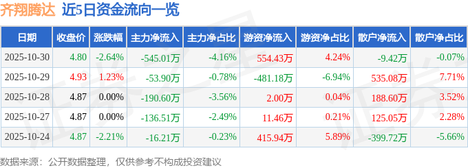 证券之星消息,截至2025年10月30日收盘,齐翔腾达(002408)报收于4.8元,下跌2.64%,换手率0.99%,成交量27.29万手,成交额1.31亿元。
