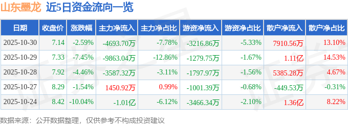 证券之星消息,截至2025年10月30日收盘,山东墨龙(002490)报收于7.14元,下跌2.59%,换手率15.33%,成交量83.04万手,成交额6.04亿元。