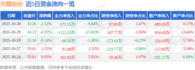证券之星消息,截至2025年10月30日收盘,天键股份(301383)报收于33.26元,下跌2.52%,换手率2.52%,成交量1.78万手,成交额5989.24万元。