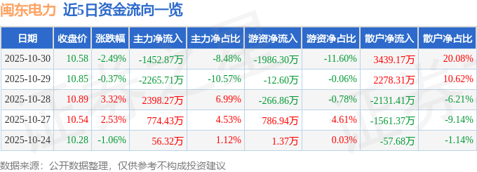 证券之星消息,截至2025年10月30日收盘,闽东电力(000993)报收于10.58元,下跌2.49%,换手率3.68%,成交量16.19万手,成交额1.71亿元。