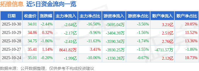证券之星消息,截至2025年10月30日收盘,拓维信息(002261)报收于34.01元,下跌2.44%,换手率4.08%,成交量46.72万手,成交额16.01亿元。