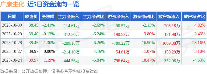 证券之星消息,截至2025年10月30日收盘,广康生化(300804)报收于38.45元,下跌2.41%,换手率3.99%,成交量1.1万手,成交额4254.14万元。