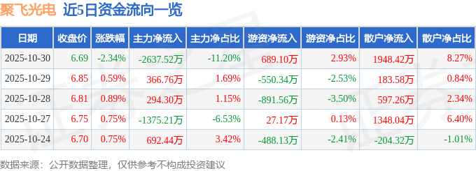 证券之星消息,截至2025年10月30日收盘,聚飞光电(300303)报收于6.69元,下跌2.34%,换手率2.63%,成交量34.93万手,成交额2.36亿元。
