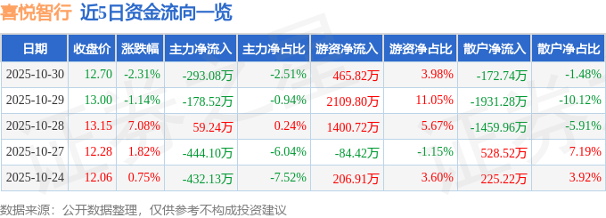 证券之星消息,截至2025年10月30日收盘,喜悦智行(301198)报收于12.7元,下跌2.31%,换手率5.83%,成交量9.07万手,成交额1.17亿元。