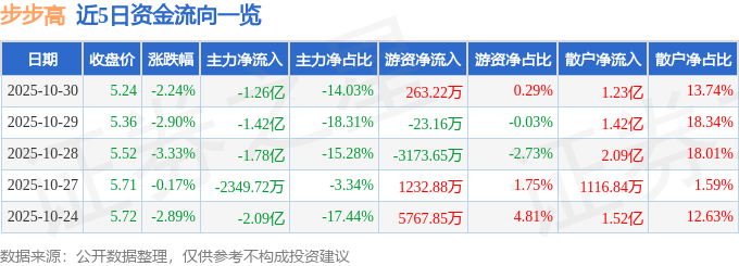证券之星消息,截至2025年10月30日收盘,步步高(002251)报收于5.24元,下跌2.24%,换手率7.96%,成交量171.41万手,成交额8.96亿元。