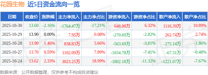 证券之星消息,截至2025年10月30日收盘,花园生物(300401)报收于13.6元,下跌2.16%,换手率1.4%,成交量7.48万手,成交额1.03亿元。