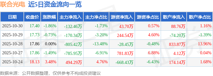 证券之星消息,截至2025年10月30日收盘,联合光电(300691)报收于17.4元,下跌1.86%,换手率1.97%,成交量4.36万手,成交额7651.86万元。