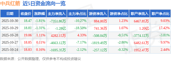 证券之星消息,截至2025年10月30日收盘,中兵红箭(000519)报收于18.47元,下跌1.81%,换手率2.77%,成交量38.63万手,成交额7.16亿元。