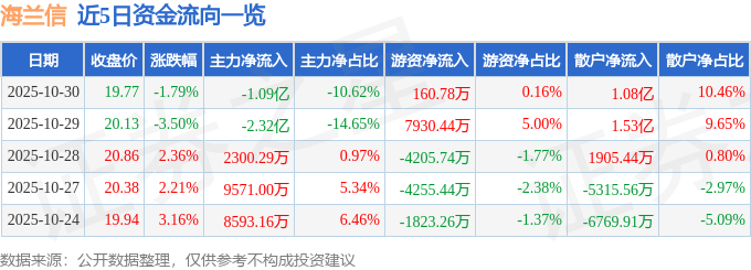 证券之星消息,截至2025年10月30日收盘,海兰信(300065)报收于19.77元,下跌1.79%,换手率7.88%,成交量51.66万手,成交额10.28亿元。