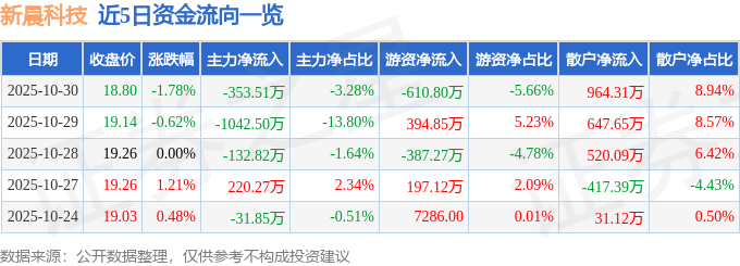 证券之星消息,截至2025年10月30日收盘,新晨科技(300542)报收于18.8元,下跌1.78%,换手率2.31%,成交量5.71万手,成交额1.08亿元。