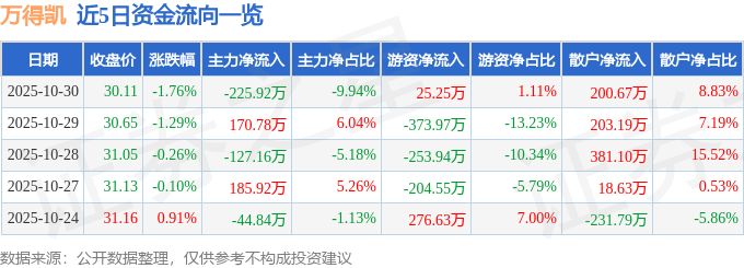 10月30日的资金流向数据方面,主力资金净流出225.92万元,占总成交额9.94%,游资资金净流入25.25万元,占总成交额1.11%,散户资金净流入200.67万元,占总成交额8.83%。