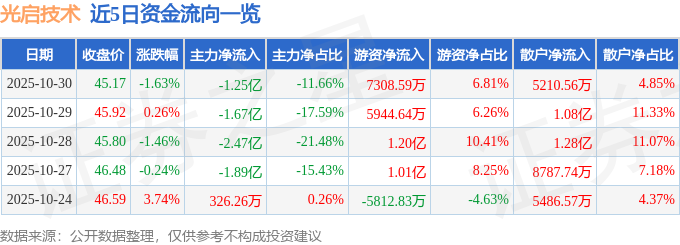 证券之星消息,截至2025年10月30日收盘,光启技术(002625)报收于45.17元,下跌1.63%,换手率1.1%,成交量23.61万手,成交额10.74亿元。