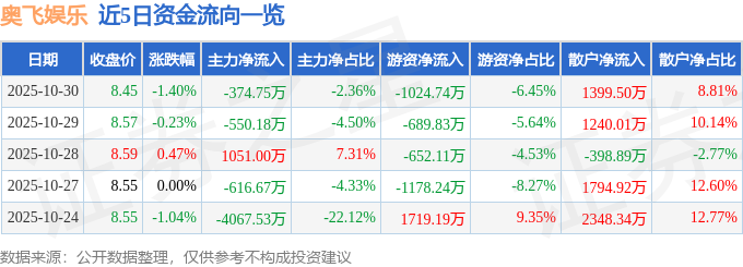证券之星消息,截至2025年10月30日收盘,奥飞娱乐(002292)报收于8.45元,下跌1.4%,换手率1.84%,成交量18.69万手,成交额1.59亿元。