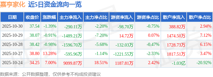 证券之星消息,截至2025年10月30日收盘,嘉亨家化(300955)报收于37.54元,下跌1.39%,换手率3.46%,成交量3.49万手,成交额1.32亿元。