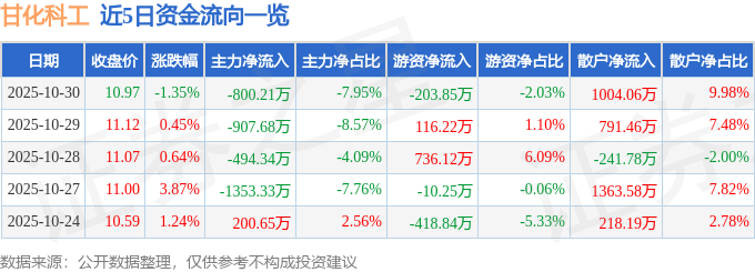 证券之星消息,截至2025年10月30日收盘,甘化科工(000576)报收于10.97元,下跌1.35%,换手率2.11%,成交量9.13万手,成交额1.01亿元。