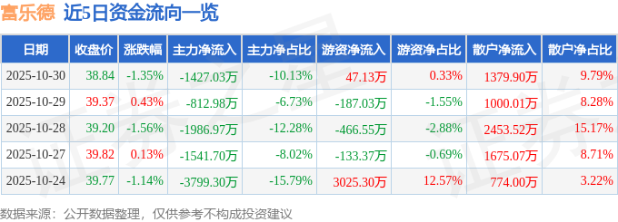 证券之星消息,截至2025年10月30日收盘,富乐德(301297)报收于38.84元,下跌1.35%,换手率2.56%,成交量3.6万手,成交额1.41亿元。