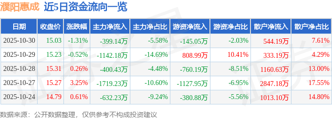 证券之星消息,截至2025年10月30日收盘,濮阳惠成(300481)报收于15.03元,下跌1.31%,换手率1.63%,成交量4.72万手,成交额7151.71万元。