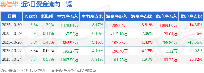 证券之星消息,截至2025年10月30日收盘,奥佳华(002614)报收于6.84元,下跌1.3%,换手率2.49%,成交量10.99万手,成交额7588.47万元。