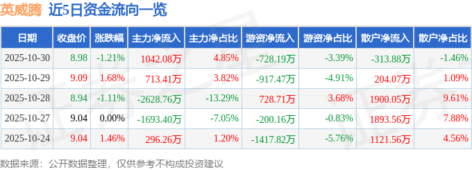 证券之星消息,截至2025年10月30日收盘,英威腾(002334)报收于8.98元,下跌1.21%,换手率3.24%,成交量23.78万手,成交额2.15亿元。