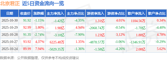 10月30日的资金流向数据方面,主力资金净流出1.42亿元,占总成交额4.35%,游资资金净流入1.31亿元,占总成交额4.01%,散户资金净流入1104.56万元,占总成交额0.34%。