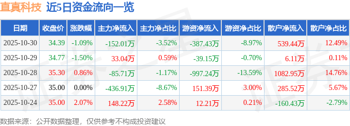 10月30日的资金流向数据方面,主力资金净流出152.01万元,占总成交额3.52%,游资资金净流出387.43万元,占总成交额8.97%,散户资金净流入539.44万元,占总成交额12.49%。
