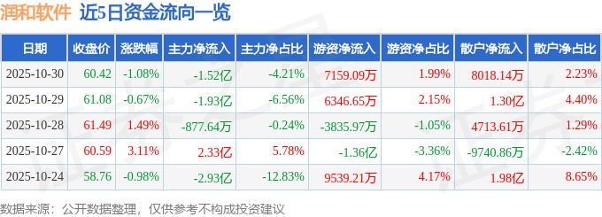 证券之星消息,截至2025年10月30日收盘,润和软件(300339)报收于60.42元,下跌1.08%,换手率7.55%,成交量58.74万手,成交额36.02亿元。