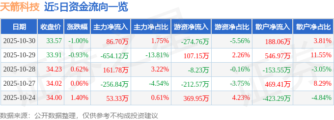 证券之星消息,截至2025年10月30日收盘,天箭科技(002977)报收于33.57元,下跌1.0%,换手率2.19%,成交量1.46万手,成交额4940.72万元。