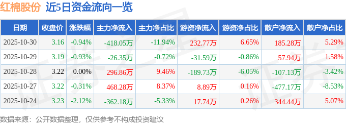 10月30日的资金流向数据方面,主力资金净流出418.05万元,占总成交额11.94%,游资资金净流入232.77万元,占总成交额6.65%,散户资金净流入185.28万元,占总成交额5.29%。