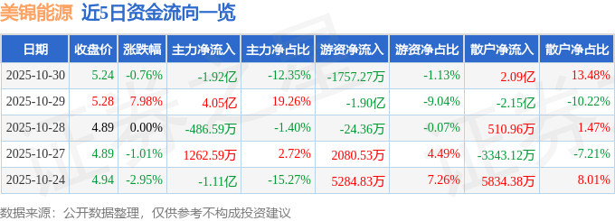证券之星消息,截至2025年10月30日收盘,美锦能源(000723)报收于5.24元,下跌0.76%,换手率6.69%,成交量294.32万手,成交额15.51亿元。