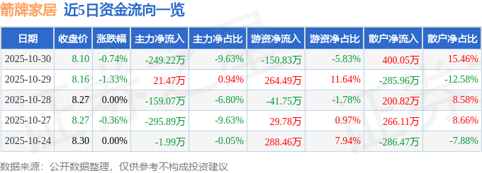 10月30日的资金流向数据方面,主力资金净流出249.22万元,占总成交额9.63%,游资资金净流出150.83万元,占总成交额5.83%,散户资金净流入400.05万元,占总成交额15.46%。