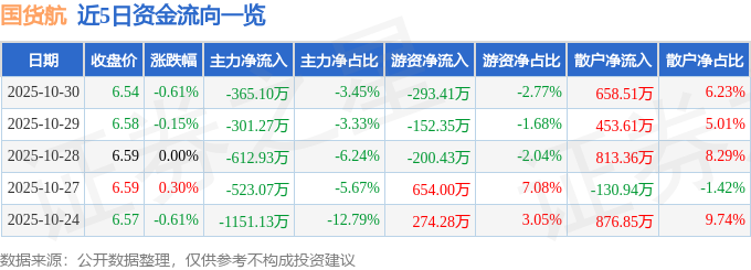 证券之星消息,截至2025年10月30日收盘,国货航(001391)报收于6.54元,下跌0.61%,换手率1.88%,成交量16.11万手,成交额1.06亿元。